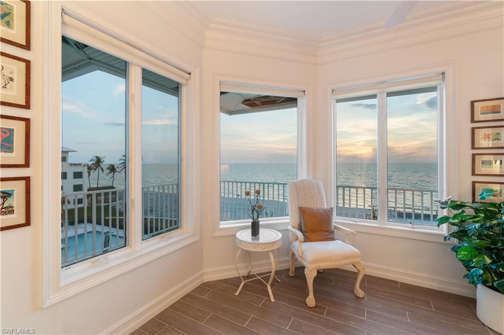 Stunning estate with breathtaking Gulf views in the highly coveted Beach Gardens of North Naples’ Barefoot Beach Community. This remarkable residence offers unparalleled views of pristine sugar sands and the turquoise waters of the Gulf, with private beach access right at your doorstep. This second position home offers coveted Southwestern rear exposure, providing gorgeous natural light throughout the day and stunning sunset views in the evening. This 4 bedroom + a den, 3.5 bathroom coast...Stunning estate with breathtaking Gulf views in the highly coveted Beach Gardens of North Naples’ Barefoot Beach Community. This remarkable residence offers unparalleled views of pristine sugar sands and the turquoise waters of the Gulf, with private beach access right at your doorstep. This second position home offers coveted Southwestern rear exposure, providing gorgeous natural light throughout the day and stunning sunset views in the evening. This 4 bedroom + a den, 3.5 bathroom coastal retreat boasts hurricane impact windows and sliders, electric hurricane shutters, a private elevator, soaring ceilings, tile flooring, and versatile ground-level flex space. The gourmet chef’s kitchen showcases beautiful coffered ceilings, white cabinetry, granite countertops, an eat-in area, and a breakfast bar for casual dining. The open-concept layout allows for a seamless flow, with a spacious living room and a formal dining area with a domed ceiling and a charming fireplace. Step outside to the second-floor wraparound screened lanai offering a direct west and southwest view, where sweeping views of the Gulf and unforgettable sunsets await. The luxurious primary suite serves as a private retreat, featuring access to its own lanai, dual walk-in closets, a wet bar with a beverage cooler, and a spa-like bathroom with dual vanities, a frameless glass shower, and a separate jetted tub. The Beach Gardens community has undergone a stunning transformation, featuring lush landscaping and a resort-style pool. Optional membership to the exclusive "Club at Barefoot" provides access to tennis, two restaurants, beachside food and beverage service, and more. Conveniently located near fine dining, RSW Airport, Mercato, and Waterside Shops, and just 15 miles from the renowned Fifth Avenue in Naples, this home is a true gem in the heart of Barefoot Beach.