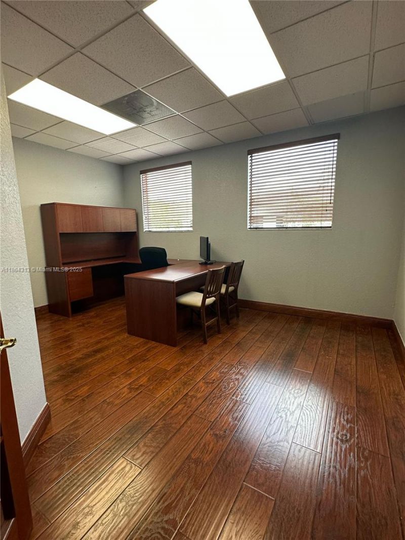 Ideal for professional offices, creative agencies, studios, or mixed-use businesses. Floorplan features six private offices with French doors, a large open workspace, a reception area, a file/storage room, a large kitchen and an ADA-compliant bathrooms. Equipped with impact-resistant windows, a balcony, and a security alarm system.Includes four assigned parking spaces for convenient on-site access.